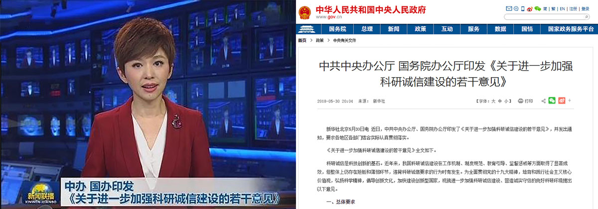 中共中央办公厅 国务院办公厅印发《关于进一步加强科研诚信建设