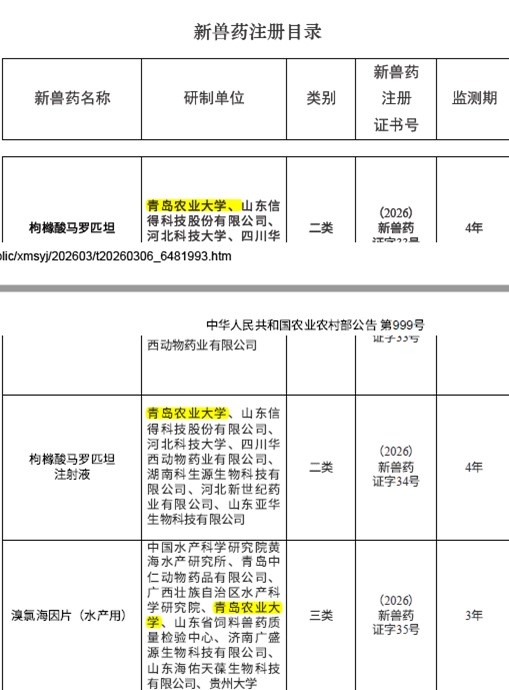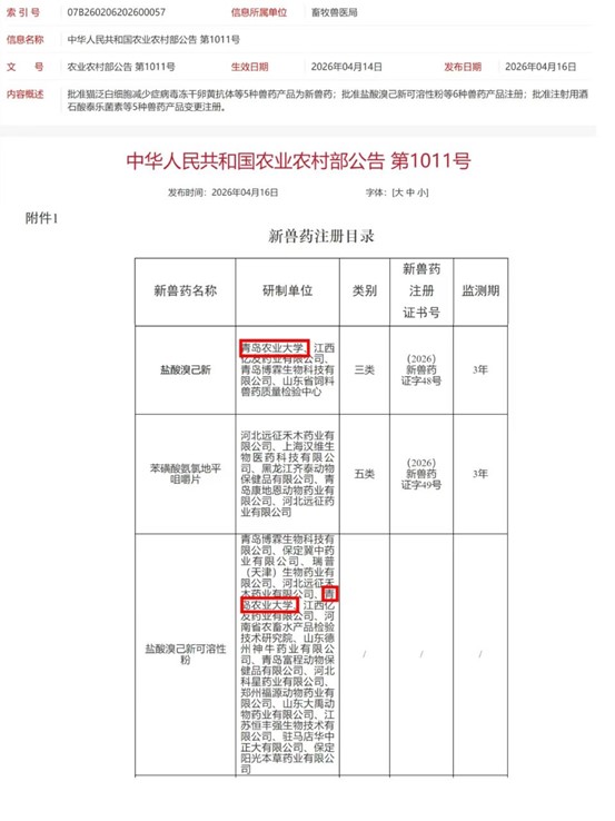 近日,农业农村部连续发布第981号、999号、1011号公告,我校化学与药学院李秋教授团队、动物医学院赵永达教授团队牵头,联合国内行业龙头企业与科研院所协同攻关完成的五款新兽药通过国家审定,正式获批国家新兽药注册证书,这标志着我校在农用生物药物创制、产学研用一体化及科研成果产业化方面再攀新高,彰显了学校在全国兽药创新领域的核心竞争力与行业引领地位。
