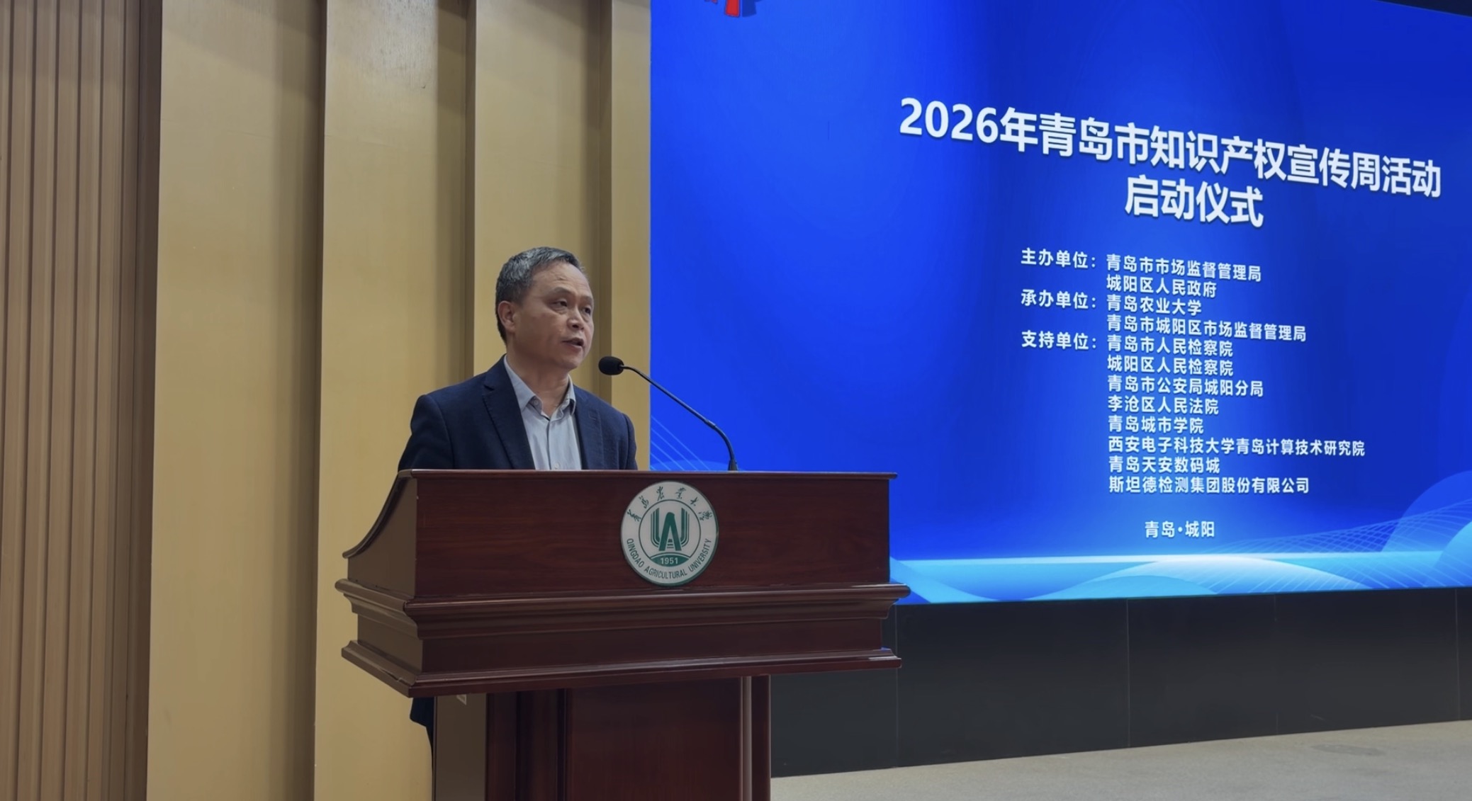 4月21日,2026年青岛市知识产权宣传周活动启动仪式在青岛农业大学学术会馆第一报告厅隆重举行,活动聚焦“加强新兴领域知识产权保护 加快新质生产力发展”主题,汇聚政产学研用多方资源,共促知识产权高质量创造、高标准保护、高效益运用,助力青岛知识产权强市与国际化创新型城市建设。青岛市市场监管局局长张咏雁、青岛农业大学副校长郭尚敬、城阳区副区长张明亮出席启动仪式并致辞。